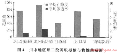 物性分析結果也顯示不同沉積微相的砂巖孔隙度和滲透率差異明顯(圖4),河道微相和砂壩相砂體與溢流砂坪相砂體相比,其平均滲透率級差可為2~3倍。利用300個巖樣滲透率分析的結果,結合前人對須二段物性分析的成果,繪制須二段滲透率平面分布圖,發(fā)現中高孔滲帶(孔隙度大于8%、滲透率大于0.1mD)主要沿主河道或次水道的流向分布,其中滲透率介于1~10mD的儲層面積約占整個砂體平面分布12%,滲透率為1~0.1mD的儲層面積約占整個砂體平面分布65%,滲透率為0.1~0.01mD的儲層面積約占整個砂體平面分布15%,滲透率小于0.01mD的儲層面積約占整個砂體平面分布8%,以上說明須二段儲層的平面非均質性較強。