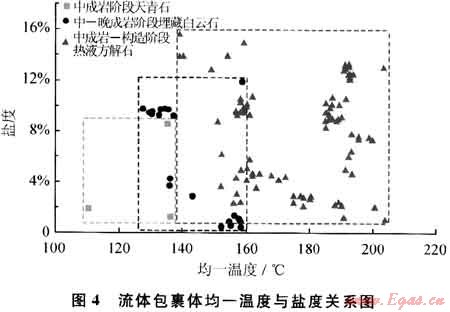 根據(jù)對充填溶蝕孔洞的各成巖階段3類13件次生礦物樣品的流體包裹體測定結(jié)果(圖4):中成巖階段天青石均一溫度為110~136℃,平均值為127℃,鹽度(NaCl質(zhì)量分?jǐn)?shù),下同)變化范圍為1.23%~8.68%,平均值為3.94%;中-晚成巖階段異形白云石均一溫度介于127~159℃,平均值為143℃,鹽度變化范圍為0.35%~11.93%,平均值為6.8%;晚成巖階段熱液方解石均一溫度介于139~203.8℃,平均值為172℃,鹽度變化范圍為1.23%~15.67%,平均值為8.2%。顯然,上述3類次生礦物都為溫度和鹽度逐漸升高的具熱鹵水性質(zhì)的成巖流體沉淀物。