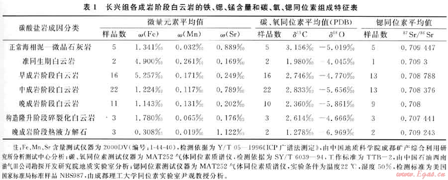 對各成巖階段白云巖的鐵、錳、鍶微量元素和碳、氧、鍶穩(wěn)定同位素分析結(jié)果由表1所示,地球化學(xué)特征研究分析如下。