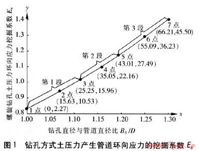 應(yīng)用上述曲線函數(shù)關(guān)系,通過(guò)VB軟件可編制出圖形查值軟件,仍以本應(yīng)用實(shí)例進(jìn)行說(shuō)明。已知鉆孔直徑與管道直徑比Bd/D值(例如Bd/D=1.228),通過(guò)圖形對(duì)應(yīng)比例關(guān)系,軟件程序計(jì)算出與Bd/D值相對(duì)應(yīng)的x值。根據(jù)x值,軟件程序自動(dòng)判定此x值所在曲線段數(shù),依據(jù)該段曲線函數(shù)關(guān)系式,求出相應(yīng)的y值。根據(jù)y值,依據(jù)圖形對(duì)應(yīng)比例關(guān)系,軟件程序計(jì)算出與其相對(duì)應(yīng)的螺旋鉆孔土壓力環(huán)向應(yīng)力挖掘系數(shù)Ee值(Ee=1.24)。