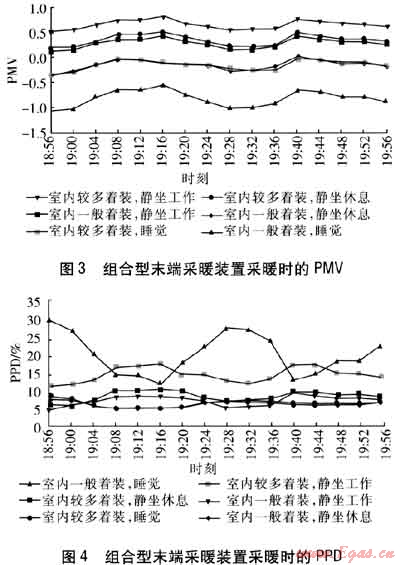 在實驗室1中,采用組合型末端采暖裝置進行采暖,開啟供暖型風(fēng)機盤管的風(fēng)機中檔后進行測試。當(dāng)CLO=1.0時,當(dāng)人員靜坐休息時,PMV的平均值為0.31,PPD的平均值為7.26%,滿足IS0 7730—2005對可接受熱環(huán)境的規(guī)定,即室內(nèi)熱環(huán)境滿足大部分人的舒適要求。靜坐工作時,PMV的平均值為0.63,PPD的平均值為13.38%,人們需將較多著裝變?yōu)橐话阒b(CLO=0.7)。變?yōu)橐话阒b后,靜坐工作時PMV的平均值為0.28,PPD的平均值為6.87%;靜坐休息時PMV的平均值為-0.04,PPD的平均值為5.20%。此時靜坐工作和靜坐休息時的熱環(huán)境均符合IS0 7730—2005對可接受熱環(huán)境的規(guī)定??梢姴捎媒M合型末端采暖裝置采暖,既符合人們的日常行為習(xí)慣,又提升了人們的生活品質(zhì)。通過對幾年實測數(shù)據(jù)的分析,建議采用組合型末端采暖裝置時,在進行維持基礎(chǔ)室溫所需的散熱器面積計算時,散熱器的散熱量宜取該房間室內(nèi)采暖設(shè)計熱負荷的40%。組合型末端采暖裝置采暖時的PMV、PPD分別見圖3、4。