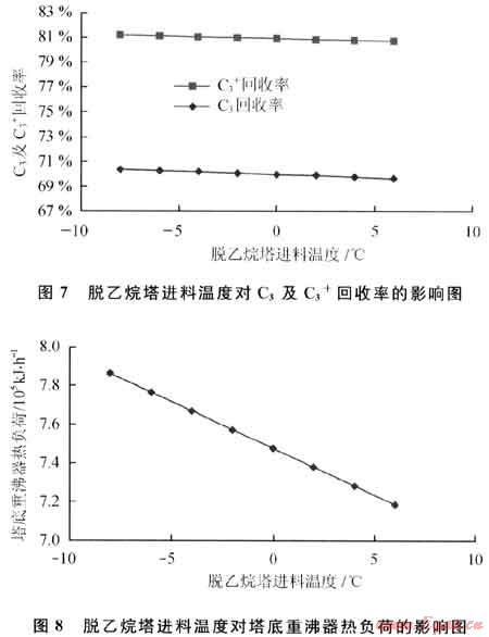 脫乙烷塔的進(jìn)料溫度對(duì)C3及C3+回收率和塔底重沸器熱負(fù)荷的影響如圖7、8所示。從圖7、8可以看出,隨著進(jìn)料溫度增加,C3及C3+回收率下降,塔底重沸器的熱負(fù)荷也隨之降低。這是因?yàn)檫M(jìn)料溫度增加,帶入了更多的熱量,從而使再沸器熱負(fù)荷減少。因脫乙烷塔塔頂沒有冷凝器,在進(jìn)料帶入更多熱量后,脫乙烷塔塔頂溫度升高,部分C3及C3+被帶走,導(dǎo)致C3及C3+回收率下降。