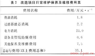 經(jīng)改造后,整個系統(tǒng)的日常維護保養(yǎng)及維修均納入氣田生產(chǎn)設施制度化管理的范圍內(nèi),按照目前氣田相同設備的維修和維護成本估算,其費用支出為35.1萬元/a,改造項目日常維護保養(yǎng)及維修費用列表見表2。