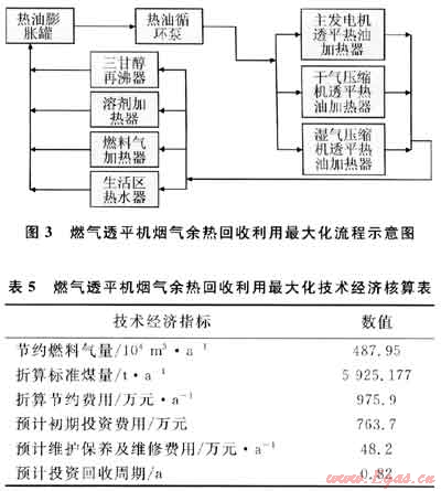如果將這些熱源用戶全部改造成熱油換熱,并充分回收利用氣田上其他所有燃氣透平機得煙氣余熱,與本文2.3中涉及的熱油循環(huán)系統(tǒng)連成一體,那么將實現(xiàn)燃氣透平機煙氣余熱回收利用最大化,其流程如圖3所示。其相應的技術經(jīng)濟核算見表5。這將會大量減少燃料氣的消耗量,提高能源的利用率,節(jié)約氣田開發(fā)生產(chǎn)成本,增加崖城氣田的經(jīng)濟效益,應用前景廣闊。