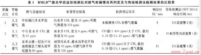 當車載式0MDTM光學(xué)甲烷探測儀甲烷值超標報警后(設(shè)定為20ppm),可用RMLDTM激光甲烷遙距檢測儀檢測在報警30m范圍內(nèi)的燃氣設(shè)施和相鄰管溝的CH4值,確定泄漏源,調(diào)頻后再檢測C0值(無管溝不需檢測),若C0值大于CH4值的0.18倍,則可判定為煤氣泄漏所致。表1是對該城市1條在役管線及支線用RMLDTM檢測儀進行的燃氣泄漏情況再判定及與傳統(tǒng)檢測法檢測結(jié)果的比較表。