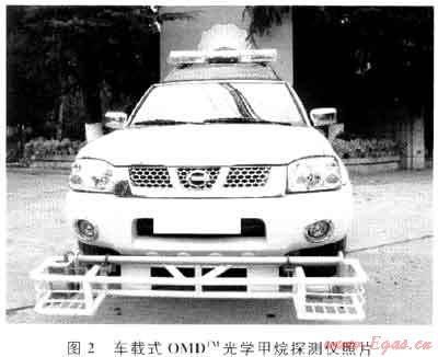 車載式OMDTM光學(xué)甲烷探測儀是專門為埋地天然氣管網(wǎng)及集輸管線設(shè)計的氣體檢漏裝置,其照片如圖2所示。紅外燈柱探測器安裝在檢測車前,可在各種環(huán)境條件下運行,不會因光柱上的塵土雪水等而引起吸收頻率的微小波動;檢測儀響應(yīng)速度快,可檢測低于1ppm(1ppm=1mg/kg,下同)濃度的甲烷泄漏,速度高達10000次/s,且穩(wěn)定性好,自身不會引起檢測系統(tǒng)發(fā)熱,系統(tǒng)工作穩(wěn)定性好。另外,0MDTM內(nèi)部有刻度校準器,能夠在任何時間檢驗探測儀和設(shè)備是否正常運行,檢測數(shù)據(jù)和GPS數(shù)據(jù)通過端口與PC連接便于數(shù)據(jù)分析與存儲。