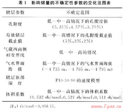儲層孔隙度在±17%范圍內變化。該變化范圍是根據(jù)本區(qū)所有開發(fā)井的非儲層巖層孔隙度的變化范圍計算得來的。表1列出了不確定范圍的主要參數(shù)。
