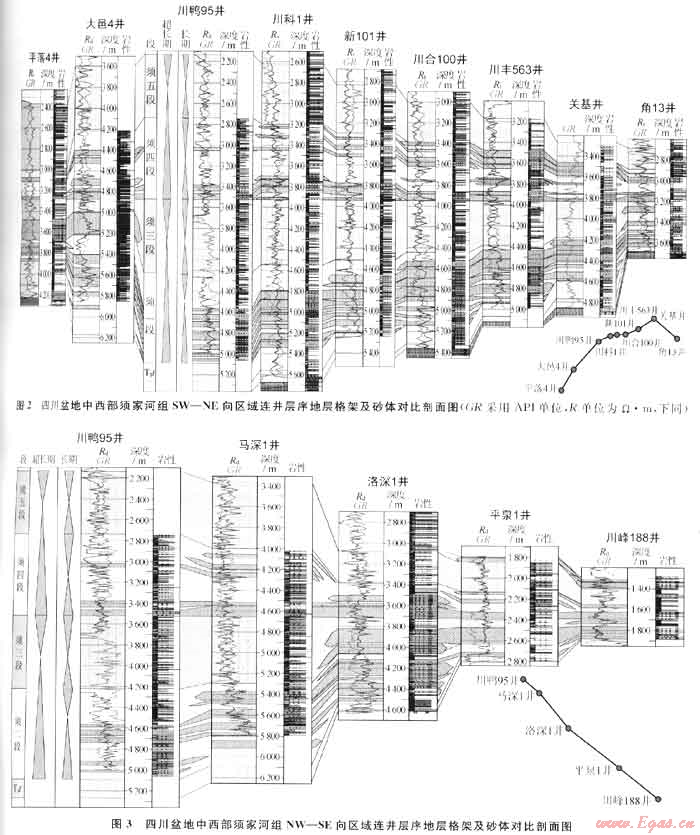 須四段沉積早期,受安縣運(yùn)動(dòng)影響,在須四段底部普遍發(fā)育砂礫巖沉積,連井地層對(duì)比剖面上可見(jiàn)(圖2、3),該時(shí)期,不同物源區(qū)砂礫巖體厚度不一,典型如川西坳陷以安縣以南的新場(chǎng)地區(qū)相對(duì)較厚,這主要與安縣地區(qū)大幅度隆升剝蝕有關(guān)。受超長(zhǎng)期基準(zhǔn)面旋回影響,須上盆水體逐漸加深,須四段中后期至須五段早期,湖盆擴(kuò)張明顯,期間沉積了須四段中上部砂巖,與須二段砂體疊加樣式相似,由川西坳陷中南段湖盆中心向東、向南、向北西斜坡超覆退積,宏觀上依然具有呈階梯狀分布特點(diǎn),尤其體現(xiàn)在須四上亞段砂體的分布特征上,在川西坳陷中段新場(chǎng)-合興場(chǎng)-豐谷地區(qū),須四段頂部砂體向東階梯狀分布特征已經(jīng)得到三維地震剖面及鉆井的證實(shí),典型如川合100井須四段頂部第一套砂體在以西的新場(chǎng)地區(qū)不發(fā)育,相變?yōu)槟?。但總體上看這一特點(diǎn)不如須二段清楚,這與龍門(mén)山抬升使川西坳陷物源復(fù)雜化有關(guān)。