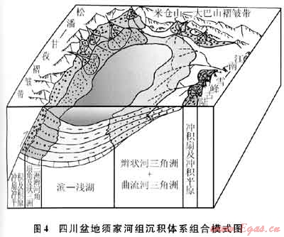 沖積扇-扇三角洲-湖泊模式于四川盆地須四下段安縣-中壩劍閣地區(qū)最為典型。該模式的特點(diǎn)是湖泊的水體靠近物源區(qū)的出口,在山口與湖泊之間缺少河流、沖積平原這一相帶,而是沖積扇直接入湖形成扇三角洲沉積,隨著扇三角洲不斷地向湖盆推進(jìn),須四段扇三角洲平原亦隨之拓寬而演變?yōu)闆_積平原,因而此模式可能隨時(shí)間的推移而被辮狀河三角洲取代。