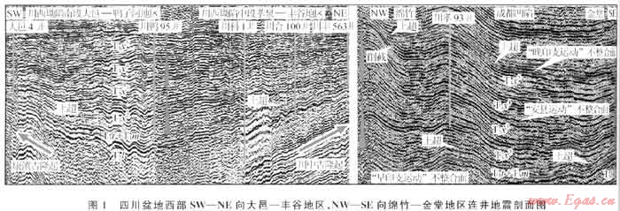 受資料限制,多數(shù)學(xué)者沉積相分析主要來(lái)自于地表露頭及鉆井資料,地震層序分析是獲得本文不同于前期地質(zhì)認(rèn)識(shí)的重要依據(jù),主要線索包括地震剖面上地層厚度變化關(guān)系、層間接觸關(guān)系,層段內(nèi)砂體或砂層組分布及疊加樣式等。主要選取了與龍門(mén)山或川西坳陷平行、垂直的NE向和NW 向區(qū)域二三維地震剖面進(jìn)行層序格架與砂體疊加樣式分析。