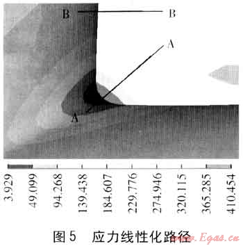 通過分析結(jié)果云圖可以查看管件應(yīng)力的分布情況。本例模型應(yīng)力最大點(diǎn)位于管件焊縫體內(nèi)側(cè),在最高工作壓力為4.0MPa時(shí)材料最大主應(yīng)力為410.454MPa。最大應(yīng)力點(diǎn)位于焊縫體內(nèi)側(cè)的圓角過渡處,該區(qū)域?yàn)檎麄€模型受力最集中的區(qū)域且其他區(qū)域的應(yīng)力均遠(yuǎn)遠(yuǎn)小于該區(qū)域,故僅對該區(qū)域進(jìn)行應(yīng)力評定和疲勞評定即可確定模型工作條件下的安全性。