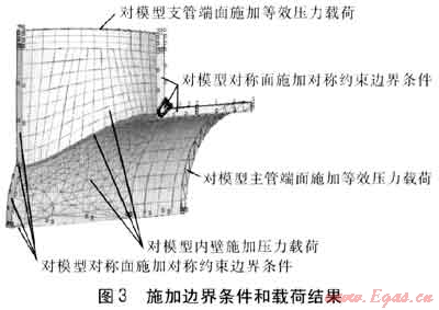 完成后通過ANSYS程序,分別對模型支管和主管端面施加等效壓力19.05MPa和23.04MPa,對模型內(nèi)壁施加工作條件下的載荷:壓力為4.0MPa。施加邊界條件和載荷結(jié)果見圖3。