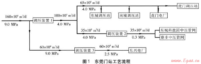 東莞門站工藝流程見圖1。出站的天然氣壓力等級有3種,分別為:①供應(yīng)東城、南城、虎門調(diào)壓站、虎門電廠,處理量為65×104m3/d,由調(diào)壓裝置1實(shí)現(xiàn)壓力由9.0MPa降至4.0MPa;②供應(yīng)東城科技園、寮步中壓管網(wǎng),處理量為35×104m3/d,由調(diào)壓裝置2實(shí)現(xiàn)壓力由4.0MPa降至0.3MPa;③供應(yīng)東興電廠(每天發(fā)電時間為16h左右),處理量為60×104m3/d,由調(diào)壓裝置3實(shí)現(xiàn)壓力由9.0MPa降至2.5MPa。