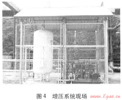 該套系統(tǒng)于2011年8月上旬開始壓縮機(jī)系統(tǒng)整體成橇和控制系統(tǒng)制作,8月下旬橇體運(yùn)到現(xiàn)場后進(jìn)行管道連接、棚架安裝、電氣安裝,9月初運(yùn)行調(diào)試。經(jīng)過一段時間的使用,工作情況保持穩(wěn)定。增壓系統(tǒng)現(xiàn)場見圖4。