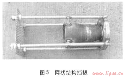 該增壓系統(tǒng)試運(yùn)行時噪聲較大,主要出現(xiàn)在儲氣罐處。由于現(xiàn)場壓縮機(jī)進(jìn)出口都采用軟管連接,并且噪聲是在增壓的高壓階段出現(xiàn),因此不是振動引起。我們對此進(jìn)行了分析,噪聲可能是由以下原因造成:進(jìn)入儲氣罐的氣流速度過快,產(chǎn)生了噪聲(聽起來類似口哨聲),同時儲氣罐的體積較大且罐壁薄,對噪聲進(jìn)行了放大。如果能夠分散進(jìn)入儲氣罐的氣流,噪聲可能會相應(yīng)降低。于是制作了網(wǎng)狀結(jié)構(gòu)的擋板(見圖5)裝于儲氣罐內(nèi)部進(jìn)氣口處。安裝完成后,經(jīng)過實際使用驗證,整體噪聲大大降低。
