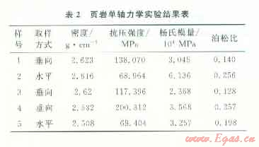 實(shí)驗(yàn)結(jié)果表明,水平方向取樣的巖樣平均楊氏模量為4.70×104 MPa,抗壓強(qiáng)度為69.18 MPa,平均泊松比為0.227;垂直方向取樣的巖樣平均楊氏模量為2.99×104MPa,抗壓強(qiáng)度為l51.92 MPa,平均泊松比為0.175(表2)。