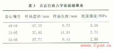 選取頁巖基質(zhì)巖石樣品,通過實(shí)驗(yàn)測量,頁巖樣品抗張強(qiáng)度介于2~4 MPa,平均為2.94 MPa(表3)。