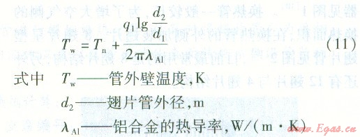 利用通過圓筒壁的導(dǎo)熱公式,計(jì)算沒有翅片部分管外壁的溫度ΤW,此溫度即為翅片的根部溫度。