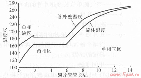 <0.05,說明假設(shè)的管內(nèi)壁溫度Tn正確,即可以進(jìn)行下一步長的計(jì)算。 取空氣溫度為l0℃,步長(進(jìn)行一次計(jì)算所取的管道長度)L=0.1 m,同時(shí)根據(jù)LNG達(dá)到泡點(diǎn)(163.7 K)時(shí)代表單相液區(qū)結(jié)束、天然氣溫度處于露點(diǎn)(211.2 K)與263 K之問時(shí)為單相氣區(qū),也可以計(jì)算出單相液區(qū)和單相氣區(qū)的長度。