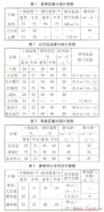 客房區(qū)、公共區(qū)域、商務(wù)區(qū)、康體中心室內(nèi)設(shè)計(jì)參數(shù)分別見(jiàn)表1~4。