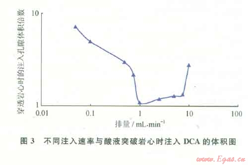 選用滲透率為5~120 mD的石灰?guī)r巖心,以某一恒定的流量注入DCA就地自轉(zhuǎn)向酸,計(jì)量酸液穿透巖心的酸液體積(孔隙體積的倍數(shù))。得到以碳酸鹽巖心注酸流量為自變量時(shí),蚓孔突破巖心需要酸液量占孔隙體積的倍數(shù)(PV)。圖3給出了滲透率范圍為5~120 mD的石灰?guī)r巖心以不同流量下注入DCA自轉(zhuǎn)向酸突破時(shí)的注入酸液孔隙體積倍數(shù)。實(shí)驗(yàn)結(jié)果表明:①注入DCA體系表現(xiàn)出突破孔隙體積與注酸流量存在一定關(guān)系;②注酸速率在0.05~1.0mL/min范圍,隨著注酸速率增大,穿透巖心所需的DCA酸液體積減少;③注酸速率在1.0~7.5mL/min范圍,隨著注酸速率增大,穿透巖心所需的DCA酸液體積呈增加趨勢(shì),但增加幅度不大;④注酸速率在7.5~10.0mL/min范圍,隨著注酸速率增大,穿透巖心所需的DCA酸液體積大幅度增加;⑤最佳的注酸流量為1mL/min,酸液突破最小注酸體積倍數(shù)為1.2 PV。