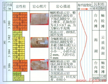 度較正常海水偏高。沉積物主要為褐灰、灰、淺灰色薄―中層狀泥質(zhì)白云巖、灰質(zhì)白云巖、泥晶白云巖、亮晶鮞粒白云巖等(圖1);根據(jù)沉積物可進(jìn)一步劃分潟湖和臺內(nèi)灘,臺內(nèi)灘以鮞粒灘為主,巖性主要為淺灰色亮晶鮞粒(粉晶)白云巖,受后期溶蝕作用影響往往形成較好的儲集層(圖1)。