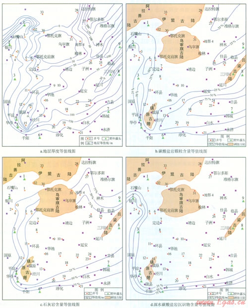 本文中深水碳酸鹽巖沉積物主要指深灰、灰黑色泥灰?guī)r、含泥灰?guī)r及泥晶灰?guī)r,其顏色較深,顆粒細(xì)小,代表較深水沉積環(huán)境。通過50余口鉆井及10條野外露頭剖面統(tǒng)計,繪制了鄂爾多斯盆地深水碳酸鹽巖沉積物含量分布圖(圖3一d),其含量大于50%的主要分布在銀川-固原-千陽-淳化-永濟(jì)一線外圍,多超盆地范圍,盆地內(nèi)深水碳酸鹽巖沉積物含量基本小于25%。