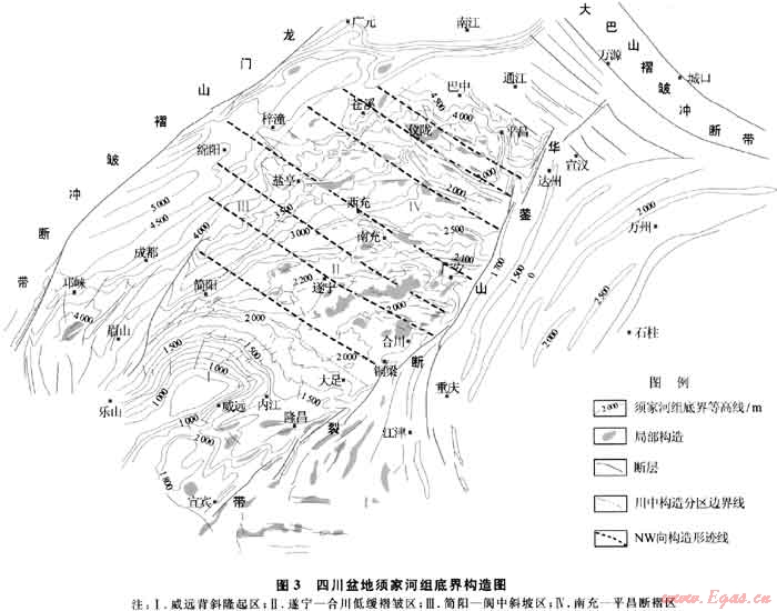 遂寧-合川低緩褶皺區(qū)東界為華鎣山斷裂。北界為廣安-南充以南,西界為簡陽-鹽亭。區(qū)內(nèi)構(gòu)造整體表現(xiàn)為東南高、西北低的大單斜,構(gòu)造走向?yàn)镹E向。遂寧-合川地區(qū)構(gòu)造更為平緩,構(gòu)造等值線稀疏,遂寧以西地區(qū)的構(gòu)造逐漸變陡。