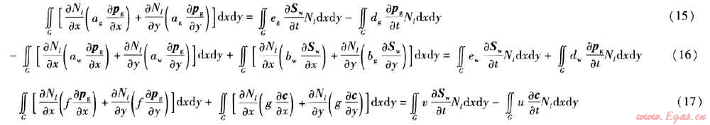 本文討論的是非穩(wěn)態(tài)的氣水滲流、氣氣擴(kuò)散問題,各參數(shù)不僅是空間域的函數(shù),而且是時(shí)間域的函數(shù),因此建立有限元方程時(shí)采用部分離散的方法[7]。對(duì)空間域的離散采用Galerkin有限元方法,對(duì)時(shí)間域的離散采用有限差分法,把型函數(shù)僅表示成空間坐標(biāo)的函數(shù),而節(jié)點(diǎn)的函數(shù)值則是時(shí)間t的函數(shù)。G表示一個(gè)有界的可度量幾何形體,在此表示積分區(qū)域。當(dāng)G為平面有界閉區(qū)域時(shí),記為D;格林公式中,當(dāng)G為空間有限曲線段時(shí),記為Γ。