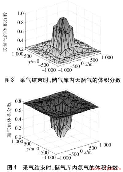 之后開始向儲(chǔ)氣庫(kù)注入天然氣,運(yùn)行到第116天時(shí),累積注入量(10022400m3)約達(dá)到目標(biāo)注氣量,停止注氣。天然氣注入結(jié)束時(shí),儲(chǔ)氣庫(kù)內(nèi)天然氣及氮?dú)獾捏w積分?jǐn)?shù)見圖1、2。由圖1、2可知,隨著天然氣的注入,天然氣逐漸將氮?dú)庀蛑車?qū)開,因而注采井周圍區(qū)域?yàn)榧兲烊粴鈪^(qū);由于氣體擴(kuò)散,天然氣與氮?dú)庀嗷交?,因而從注采井逐漸向外,天然氣的體積分?jǐn)?shù)逐漸減小,氮?dú)獾捏w積分?jǐn)?shù)逐漸增大,形成天然氣與氮?dú)獾幕旌蠋?;再逐漸向外,為純氮?dú)鈪^(qū)。