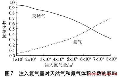 在初始建庫(kù)過程中,首先需要向儲(chǔ)氣庫(kù)中注入一定量的氮?dú)猓獨(dú)獾亩嗌賹?duì)采出氣中氮?dú)夂坑泻艽笥绊?。假定?chǔ)氣庫(kù)總儲(chǔ)氣量仍為0.1×108m3,注采速度為8.64×104m3/d。要達(dá)到目標(biāo)注氣量,在注氣速度相同的情況下,需要注入116d。由于我們更關(guān)心采出氣的質(zhì)量,在此以回采到第165天為例,分析注入不同氮?dú)饬繒r(shí)采出氣的質(zhì)量,從而確定氣體的混合程度。