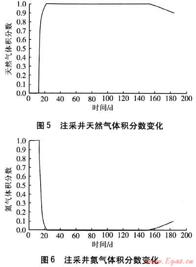 圖5、6為儲(chǔ)氣庫(kù)運(yùn)行過程中注采井天然氣及氮?dú)怏w積分?jǐn)?shù)變化情況。最初12d為注入氮?dú)怆A段,天然氣的濃度為0。第13天開始注入天然氣,由于氣體擴(kuò)散,注采井處的天然氣濃度會(huì)逐漸變大,井口處天然氣濃度上升很快。運(yùn)行到第22天時(shí),井口處天然氣體積分?jǐn)?shù)達(dá)到1,此后井口處一直為純天然氣。在回采過程中,初始時(shí)由于距注采井一定距離內(nèi)為純天然氣區(qū),采出氣中天然氣體積分?jǐn)?shù)仍為1。隨著采氣的進(jìn)行,天然氣與氮?dú)獾幕旌蠋Р粩嘞蜃⒉删幰苿?dòng),回采至第148天時(shí),開始出現(xiàn)氮?dú)?,此時(shí)氮?dú)怏w積分?jǐn)?shù)為3×10-6。隨著回采的繼續(xù)進(jìn)行,采出氣中氮?dú)夂吭絹碓酱?,到停止回采時(shí),氮?dú)怏w積分?jǐn)?shù)達(dá)9.665%。