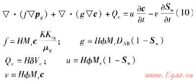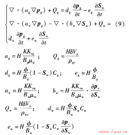 將氣水滲流連續(xù)性方程、運(yùn)動(dòng)方程、氣體狀態(tài)方程、飽和度平衡方程以及毛管壓力方程整理后,得到氣水兩相滲流方程為: