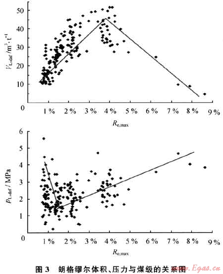 2) 華北地區(qū)石炭 二疊系各煤類朗格繆爾體積與煤級的關(guān)系呈現(xiàn)出兩段式變化模式,即煤化程度在Ro,max<4%之前,VL,daf隨Ro,max的增加而增大,當(dāng)Ro,max>4%后,VL,daf隨Ro,max的增加而減少;朗格繆爾壓力與煤級關(guān)系復(fù)雜,數(shù)據(jù)十分離散。
