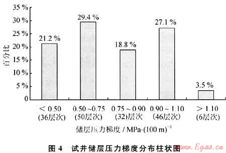 其中,嚴(yán)重欠壓儲層(儲層壓力梯度小于0.5MPa/100m)占21.2%,欠壓儲層(儲層壓力梯度介于0.5~0.75MPa/100m)占29.4%,略欠壓儲層(儲層壓力梯度介于0.75~0.90 MPa/100m)占18.8%,正常壓力儲層(儲層壓力梯度介于0.90~1.10MPa/100m)占27.1%,超壓儲層(儲層壓力梯度大于1.10MPa/100m)占3.5%(圖4)。儲層壓力梯度總體隨埋深的增加呈現(xiàn)出增大的趨勢(圖5)。
