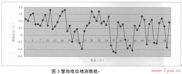 對(duì)整體管道的自然電位測(cè)試和原犧牲陽極保護(hù)系統(tǒng)進(jìn)行測(cè)試,大部分管道處在自然腐蝕電位狀態(tài)(-0.45V,Cu/CuS04參比電極),所測(cè)的60處管地電位在-0.49V~-0.72V之間波動(dòng)(見圖3),其中正值占77%,最負(fù)值-0.49V,達(dá)不到管道陰極保護(hù)電位(即管/地界面極化電位)要求的-0.85V,即管道運(yùn)行沒有處于陰極保護(hù)狀態(tài)。