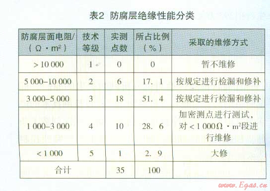 35個(gè)測(cè)點(diǎn)的防腐層電阻率從826Ω·m2~8 218Ω·m2,管道的外防腐層電阻率犬部分在3 000Ω·m2~5 000Ω·m2,平均值為3 996Ω·m2,說明管道防腐層等級(jí)基本上為“差”。