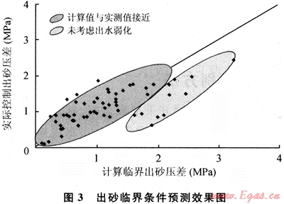 從圖3可以看出,25%的井的臨界壓差計(jì)算結(jié)果與實(shí)際出砂壓差偏差較大,分析其原因,這些井的實(shí)際生產(chǎn)壓差都較高,出水較多。氣井在開(kāi)采過(guò)程中的出水將導(dǎo)致地層強(qiáng)度減弱,降低出砂的臨界壓差,使地層更容易出砂。