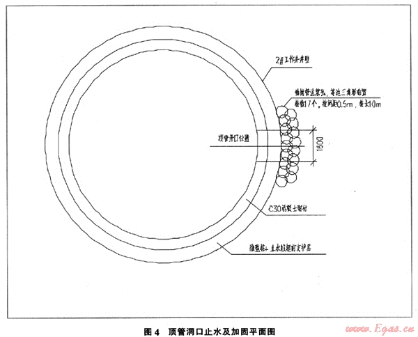 工作難點(diǎn):由于頂管洞口開口部位位于細(xì)砂層中,若直接在井壁開口將會有大量泥沙涌人作業(yè)井,引發(fā)地面塌陷。解決辦法:開口前。在支護(hù)結(jié)構(gòu)外圍施工兩排注漿孔,共17孔,采用袖閥管注漿法加固洞口外圍砂層,止水防滲。加固結(jié)構(gòu)見圖4。開口后洞口采用砌磚封門。