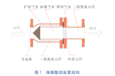氣體由入口進入,經(jīng)導流錐進入一個比所測量的管道標準口徑尺寸更大的擴容氣室。不管進口前端氣體如何分布,在擴容氣室內將進行重新分布,然后經(jīng)過一級整流元件對氣體進行降噪和初級整流。經(jīng)過一級整流元件后,氣體在標準氣室內的密度會變得很均勻,在此處的氣體流場基本定型。經(jīng)過一級整流元件后氣體進入補償元件,在補償元件實現(xiàn)對氣體流場的再次分布。補償元件與二級整流元件之間有緩沖氣室。氣體經(jīng)過補償元件后經(jīng)緩沖氣室到二級整流元件,在二級整流元件對氣體進行二級整流,經(jīng)過二級整流后,流場穩(wěn)定。在各種流場不穩(wěn)定的環(huán)境下使用本降噪整流裝置能夠使流場高度一致。