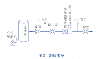 試驗中,用來產(chǎn)生超聲波噪聲的設備是調壓器。在氣體流動的過程中,調壓器兩側的壓力差越大所產(chǎn)生的超聲波噪聲越大。本測試的方法是:在一個容積為5m3的緩沖罐中充入空氣,使其內部達到500kPa左右的絕對壓力,緩沖罐的一側接有DN 50mm的管道,管道上依次接有蝶閥、壓力表1、調壓器、降噪整流裝置、AS超聲波流量計、壓力表2和球閥。為了模擬實際使用現(xiàn)場,特約束了它們之間的距離。蝶閥與壓力表1相距10D(D為管道公稱直徑),壓力表1與調壓器相距15D,調壓器與降噪整流裝置相距5D,降噪整流裝置與AS超聲波流量計直接連接,超聲波流量計與壓力表2相距10D,壓力表2與球閥相距10D,測試系統(tǒng)見圖2。選用的AS超聲波流量計規(guī)格為DN 50mm,始動流量為0.37m3/h,流量范圍為3~150m3/h。