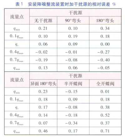 試驗的流程為:先在被檢表位置安裝降噪整流裝置和AS超聲波流量計,在無干擾源的情況下進行檢定;檢定完成后在降噪整流裝置的上游安裝上干擾源,按照以上流量點再次進行檢定。檢定完畢后統(tǒng)計數(shù)據(jù),進行分析,具體數(shù)據(jù)見表1。測試了常見的5種干擾源,分別為:90°彎頭、180°彎頭、異面180°彎頭、半開的蝶閥、全開的蝶閥。