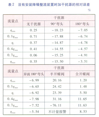 為了使試驗結果更有對比性和說服力,對沒有安裝降噪整流裝置的AS超聲波流量計進行了相同的試驗。試驗完畢后對數(shù)據(jù)進行了統(tǒng)計,具體數(shù)據(jù)見表2。通過數(shù)據(jù)分析,沒有安裝降噪整流裝置的AS超聲波流量汁在以上5種干擾源的環(huán)境下測量出來的相對誤差偏離非常大,最大達到了-76.11%左右。因半開的蝶閥能使氣流的方向傾斜向管壁,對AS超聲波流量計的計量結果影響最為突出。在檢定qmax流量點時因受斜向氣流的干擾,AS超聲波流量計出現(xiàn)了不計量報警的異常狀態(tài)。在超聲波流量計的電子系統(tǒng)中,能有效剔除由混響、電磁干擾等引起的計量誤差的算法不能消除機械情況下的干擾引。由此說明降噪整流裝置在整流方面起著決定性的作用。