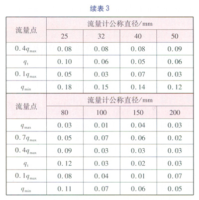 試驗的方法為:在標準表校驗裝置上被檢表的位置安裝好待測的儀器后,按照校驗流量計的方法分別對qmin、0.1qmax、qt、0.4qmax、0.7qmax和qmax的流量點進行校驗。qmin為流量計的標稱最小流量;qmax為流量計的標稱最大流量;qt為分界流量,即流量范圍被分割成“高區(qū)”和“低區(qū)”的分界點的流量,“高區(qū)”的準確度等級為流量計的標稱準確度等級,“低區(qū)”的準確度等級為流量計的標稱準確度等級的2倍。