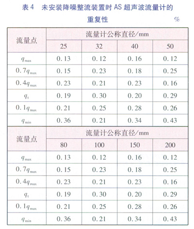 為了使得試驗結果更具有對比性,把各個口徑的AS超聲波流量計拆下降噪整流裝置后按照所校驗流量點進行檢定,并統(tǒng)計各個流量點的重復性,見表4。