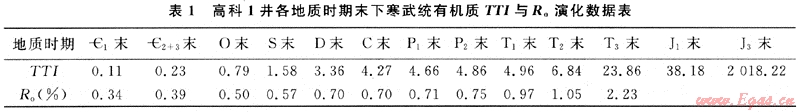 根據(jù)高科1井的沉積埋藏史圖(圖4)可見,樂山-龍女寺古隆起區(qū)下寒武統(tǒng)源巖經(jīng)歷了埋藏-抬升(剝蝕)-再埋藏-再抬升的演化過程。其有機(jī)質(zhì)生烴史可分為三期:第一期為初始生烴階段:高科1井下寒武統(tǒng)源巖在志留紀(jì)末R。值已達(dá)0.7%,處于未成熟一低成熟生烴期;第二期為生烴停滯階段,由于加里東運(yùn)動(dòng)的抬升作用,該井下寒武統(tǒng)源巖埋深變淺并遭受剝蝕,古地溫降低,有機(jī)質(zhì)進(jìn)入生烴滯流階段;第三期為“二次生烴”階段:從二疊系開始至二疊系末,下寒武統(tǒng)源巖埋藏深度及其所具有的古地溫已超過了初始生烴階段,源巖進(jìn)入了二次生烴階段。此時(shí),高科1井毛。源巖Ro值已達(dá)0.71%,有機(jī)質(zhì)開始繼續(xù)生烴。印支末期,高科1井源巖Ro值已達(dá)0.97%而進(jìn)入生烴高峰。燕山期該井源巖Ro值已達(dá)2.23%,有機(jī)質(zhì)大量生成濕氣及油裂解氣。喜山期,該區(qū)源巖進(jìn)入過成熟末期,現(xiàn)今實(shí)測(cè)最高Ro值已達(dá)3.75%,表明該區(qū)下寒武統(tǒng)源巖目前生烴已近枯竭,但也說明它的生烴能力巨大,歷史上曾經(jīng)大量生烴(表1)。