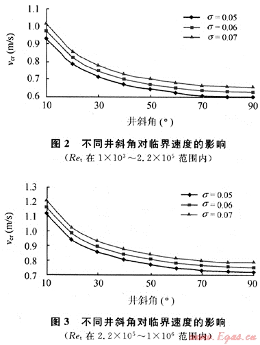 圖2、圖3分別描述了不同表面張力下井斜角與臨界速度的關(guān)系。由于定向氣井中井斜角的存在,使得定向氣井的臨界攜液產(chǎn)量要比直井臨界攜液產(chǎn)量大得多;同時隨著井斜角度的增大,氣井的臨界攜液產(chǎn)量逐漸減小,當(dāng)井斜角為直角時,氣井的臨界產(chǎn)量符合直井的臨界產(chǎn)量。