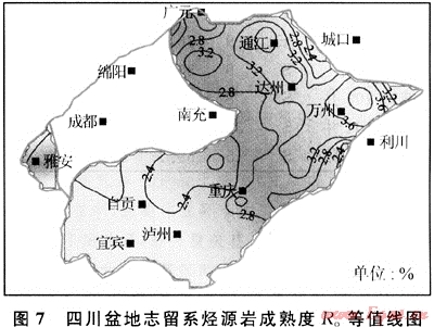 四川盆地下志留統(tǒng)泥質(zhì)烴源巖Ro值為2.2%~4.0%,已演化至過成熟階段。川南地區(qū)成熟度較低,普遍小于2.8%(圖7)。晚二疊世末,志留系源巖Ro值演化至0.9%,開始進(jìn)入成油期。三疊紀(jì)之后,由于沉積速度加快,志留系埋藏速率也相應(yīng)加快,志留系烴源巖在壓力和溫度作用下,熱演化加速。到中三疊世末時(shí),很多地區(qū)的Ro值已迅速演化至1.3%。志留系烴源巖生成大量的液態(tài)烴。中侏羅世后,沉積作用仍然快速進(jìn)行,志留系地層仍處于快速埋藏狀態(tài),Ro值從1.3%迅速演化至2.2%,有機(jī)質(zhì)演化至高成熟期,處于濕氣轉(zhuǎn)化階段。從白堊系開始,大部分地區(qū)的志留系烴源巖有機(jī)質(zhì)R。值都超過了3%,進(jìn)入過成熟期,主要形成干氣。