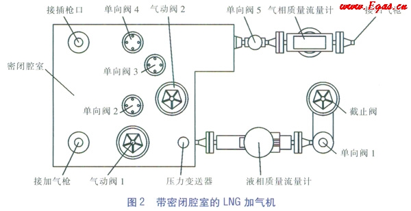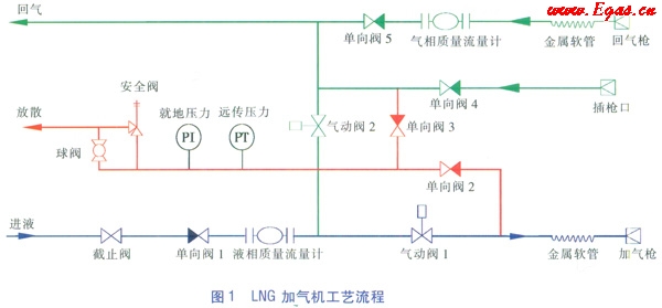③LNG加氣機(jī)加氣流程:LNG從加氣機(jī)進(jìn)液管道流向截止閥、單向閥1、液相質(zhì)量流量計(jì)、氣動(dòng)閥1、金屬軟管、加氣槍,然后進(jìn)入車載氣瓶。