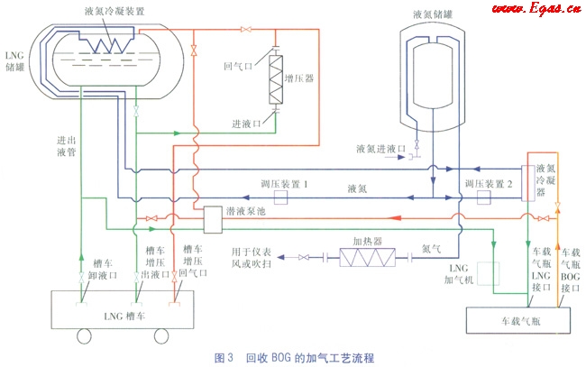 在某些LNG加氣站中,采用低溫液氮作為載冷介質(zhì)循環(huán)供冷使BOG液化,氣化的氮?dú)饪梢宰鳛?/span>LNG加氣站中氣動(dòng)閥儀表風(fēng)用氣和吹掃氣體使用,工藝流程見(jiàn)圖3。